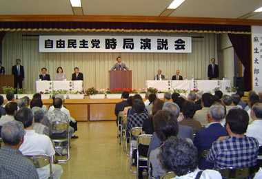13:30 大館市時局講演会、地元野呂田芳成先生・外務大臣麻生太郎先生、元オリンピック金メダリストで参議院議員荻原健司先生を弁士にお招きして。