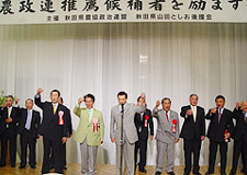 ▲秋田県農協政治連盟の励ます会。山田としお候補とともに。